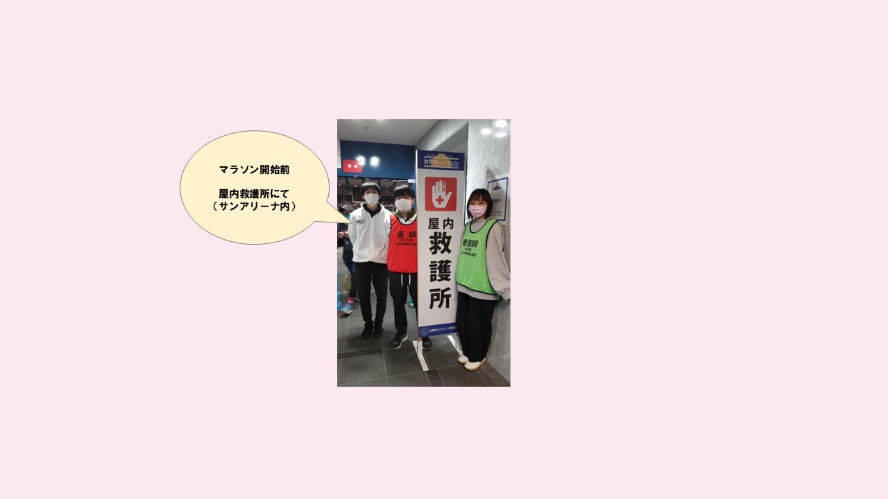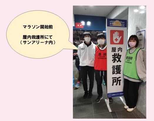 コースに設けられた6か所の救護所に分かれ、医師、看護師、事務職員が1つのチームとなり救護に携わりました。救護所を訪れた方々は、脱水症状や脚の痛み、転倒による擦過傷などへの処置が中心で、大きなトラブルはなく救護を終えることができました。医療職としてのやりがいを改めて感じた1日でした。